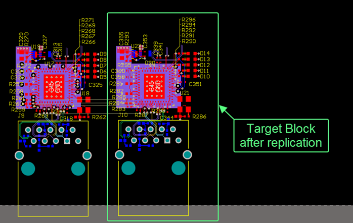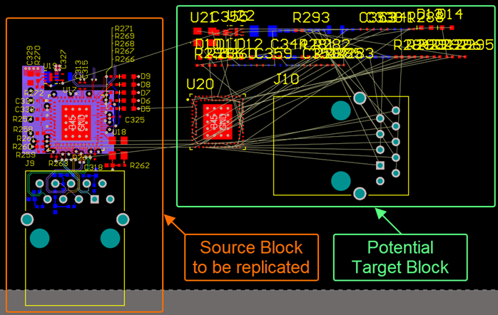 Alat za replikaciju dijelova tiskane pločice omogućava repliciranje blokova koji se ponavljaju u projektu tiskane pločice. Ovaj alat je savršen kada trebate brzo replicirati raspored grupe komponenata u drugu grupu istih, još ne postavljenih komponenata sa istim spojevima. Na PCB dokumentu može se odabrati dio snimljenog projekta koji će se replicirati (izvorni blok), a zatim se taj raspored može primijeniti na svaki dio projekta za koji se otkrije da se podudara (ciljani blokovi). Imate potpunu kontrolu nad tim na koje ciljane blokove primijeniti replikacija i možete odrediti što bi ta replikacija trebala uključivati osim rasporeda komponenata (npr. tiskane vodove).